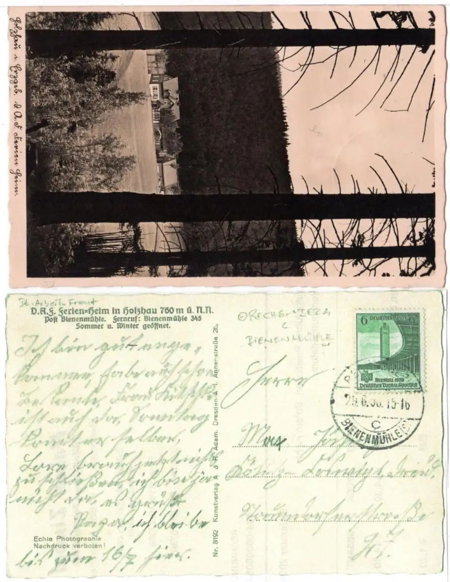 Holzhau D.A.F. Ferienheim, 1938 v. Rechenberg Bienenmühle gebr. sw-AK m. 6 Pf.