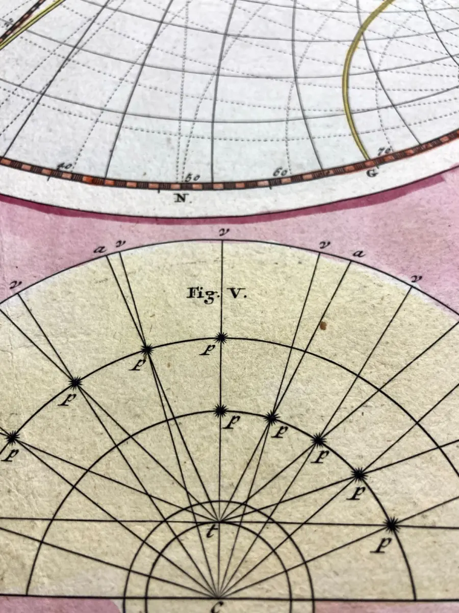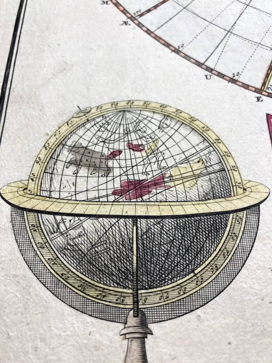 Altkolorierter Kupferstich - Geografische und astronomische Karte / Himmelskarte. Zeigt die äquatorial, ekliptikalen, tropischen und polaren Umlaufbahnen auf den Längen- und Breitengraden. Zwei kleinere Diagramme (unten) zeigen die Sonnenpositionen in Relation zur Erde mit ihrer Lichtbrechung. In den Ecken Darstellung von 2 Globen (unten) und 2 astronomischen Instrumenten (oben). -