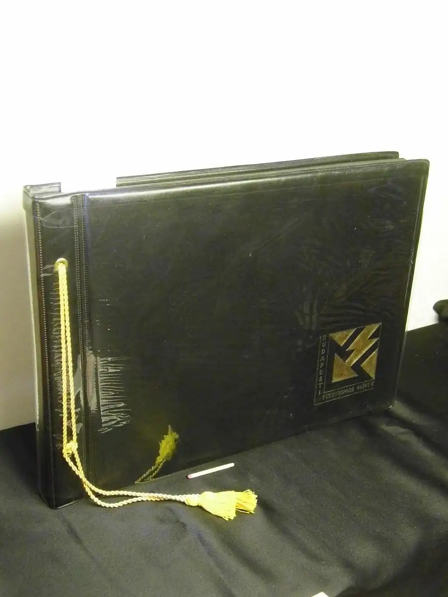 BILDBAND, STADTBELEUCHTUNG, UNGARN, - prächtiges Album komplett auf schwarzem Karton, mit 29 montierten meist ganzseitigen Sepia-Fotos, die die Beleuchtung der Stadt hauptsächlich der Sehenswürdigkeiten dokumentieren, teils mit 2 Fotos auf einer Seite (am Tage und nachts), seltene vermutlich in Handarbeit hergestellte Freundschaftsgabe, die Bildbeschreibungen sind in ungarischer, englischer, russischer, deutscher und französischer Sprache in weißer Schrift gedruckt, - leicht berieben und bestoßen, ungebrauchte Erscheinung, - internG-BR-549a-259 - schwarze Kunststoffmappe mit Kordelbindung.