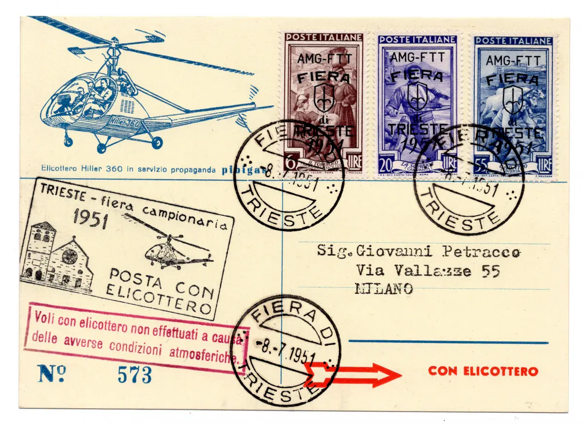 Postkarte - Hubschrauber Triest/Udine vom 8.7.51 - Postkarte für den Feierflug der Meistermesse vorbereitet, der nicht bei widrigen Wetterbedingungen durchgeführt wurde (Kat. Pilger Nr. 430) - Selten Cod. 706/17
