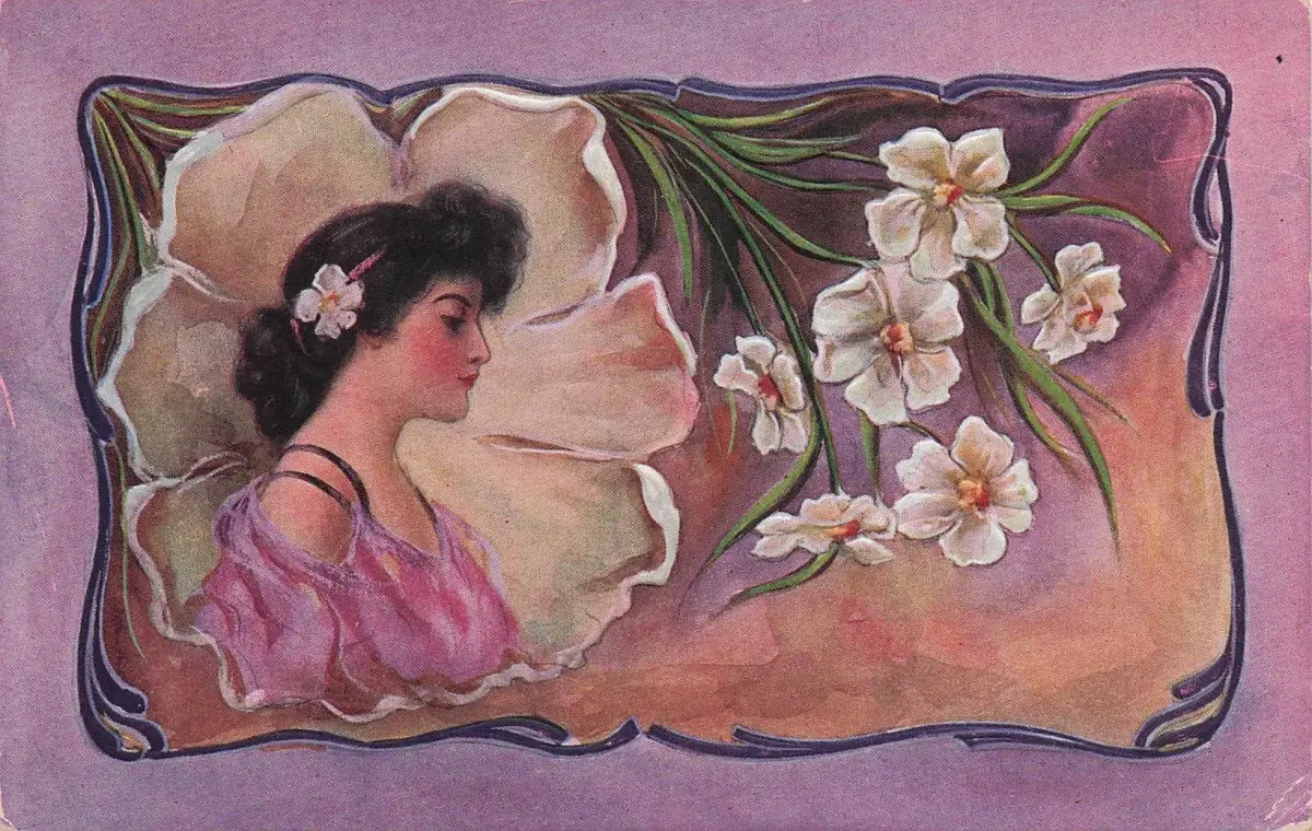 Hübsche Frau im Seitenprofil mit weißen Blumen, antike Jugendstil-Postkarte von 1914 -798374
