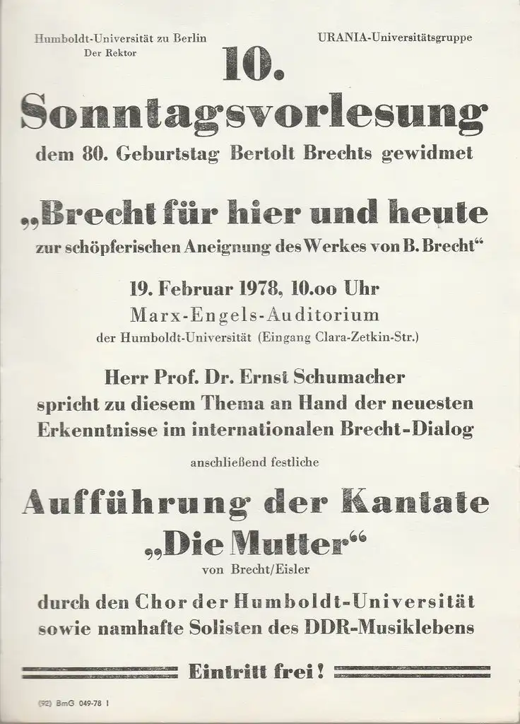 10. Sonntagsvorlesung dem 80. Geburtstag Bertolt Brechts gewidmet. Brecht für hier und heute zur schöpferischen Aneignung des Werkes von B. Brecht. Programm: Ernst Schumacher spricht zum Thema. Aufführung der Kantate DIE Mutter von Brecht / Eisler durch den Chor der Humboldt-Universität sowie Solisten des DDR-Musiklebens - Theaterprogramm, Opernprogramm, Ballettprogramm, Musicalprogramm, Konzertprogramm, Theatermemorabilia, Programmhefte Sammlung, deutsche Theatergeschichte.