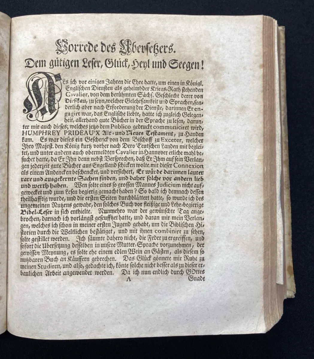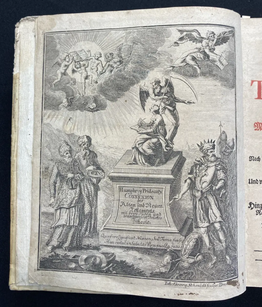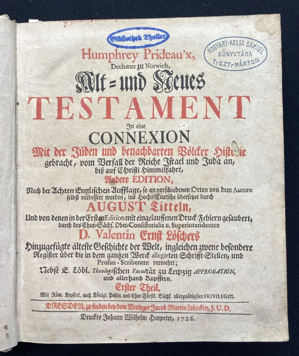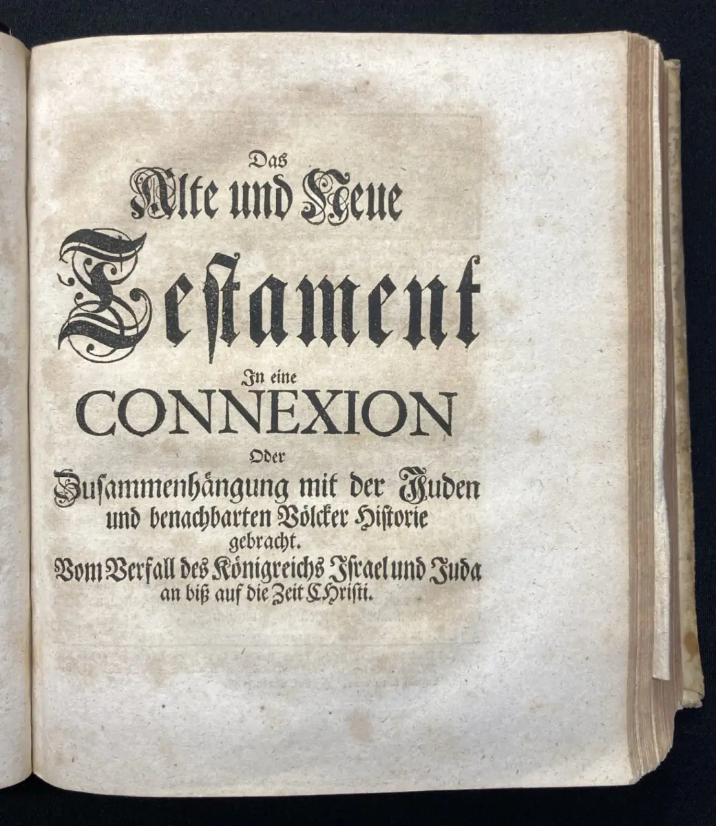 Alt- und Neues Testament. In eine Connexion Mit der Jüden und benachbarten Völcker Historie gebracht... Andere Edition, nach dere Achten Englischen Aufflage...ins Hoch-Teutsche übersetzt durch August Titteln, Und... durch Valentin Ernst Löschers Hinzugefügteste älteste Geschichte der Welt Teil 1(von 2)