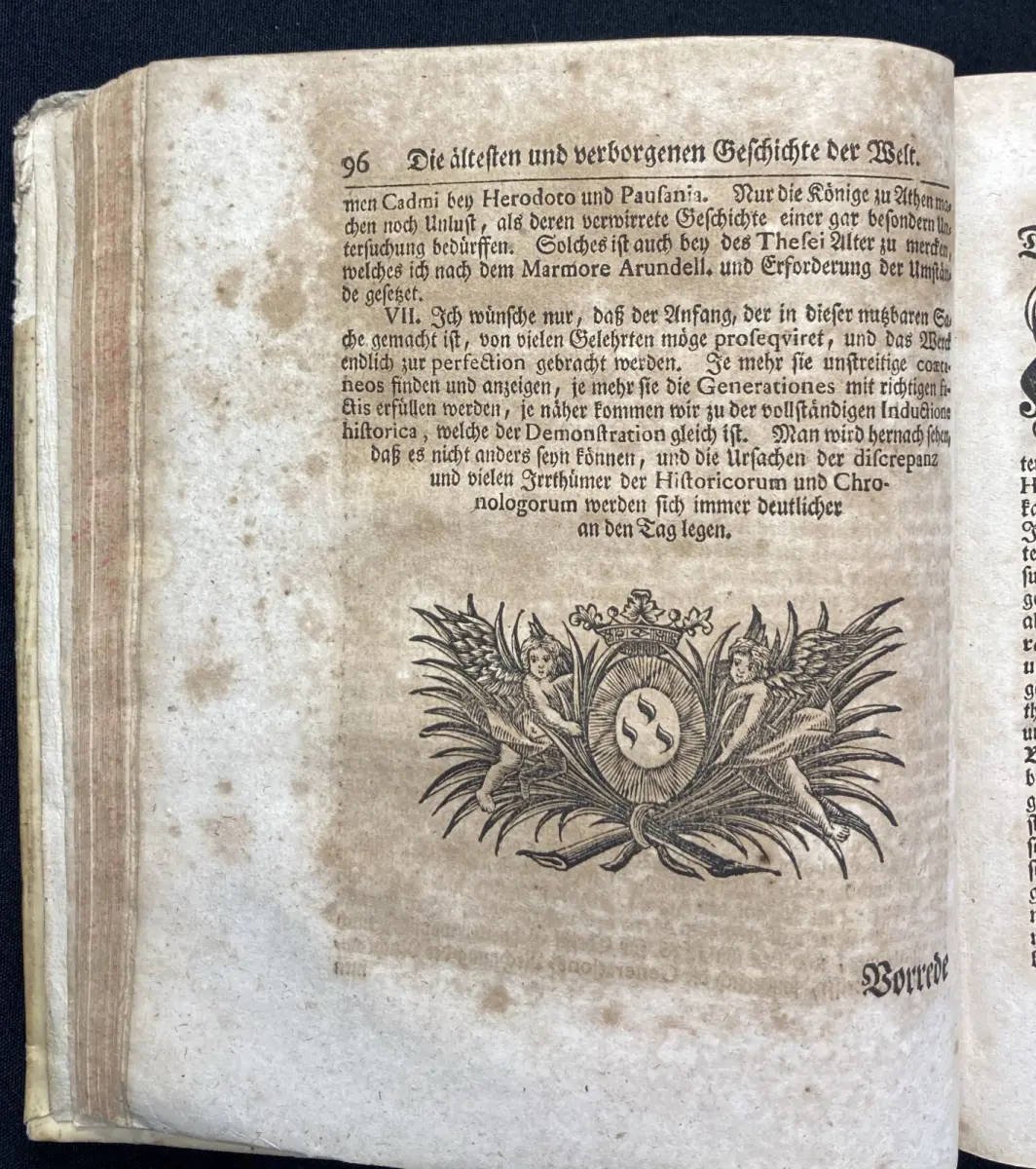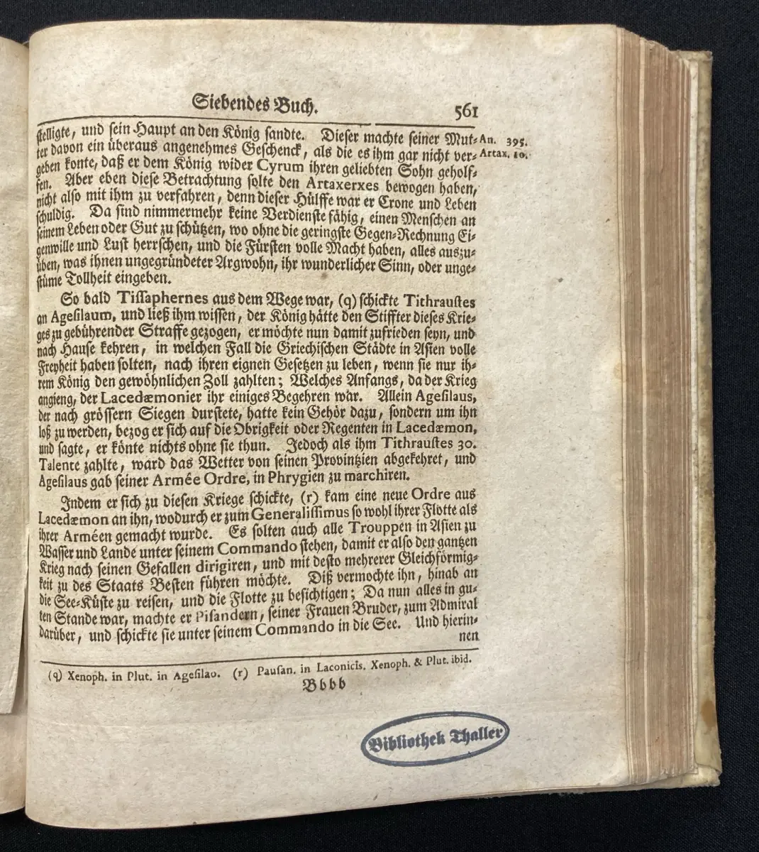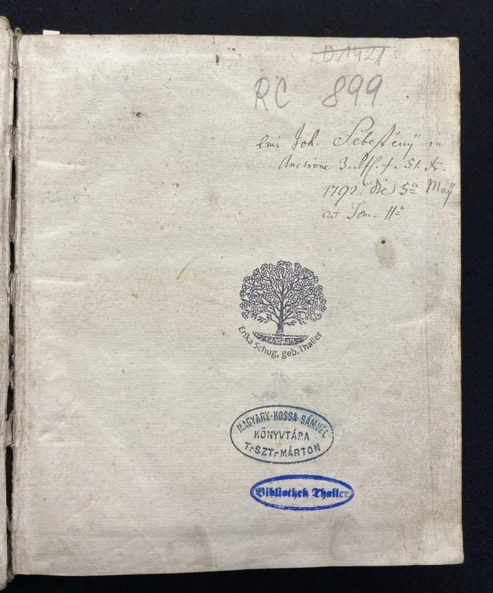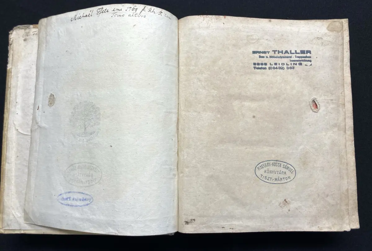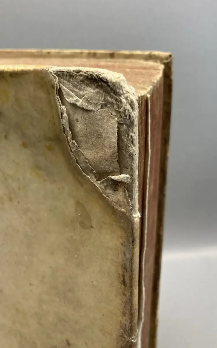 Einband hinten fleckig, Ecken bestoßen. Vorderer Deckel mit Fehlstelle oben rechts. Stempel befinden sich auf beiden Spiegel, Schmutzbll., Titel Frontispiz verso und letzte Seite unten rechts, auch vereinzelt auf machen Seiten. Papier gering gebräunt, manche Seiten mit kleinem Wurmfraß. Erste 4 Seiten mit Löchlein(wahrscheinlich durch einen Stift)