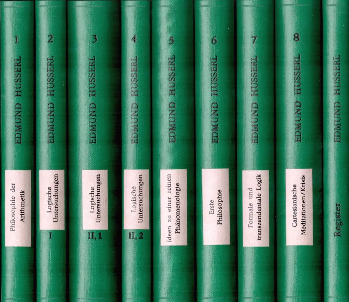 1]: Philosophie der Arithmetik. Text nach Husserliana XII. | 2]: Logische Untersuchungen, Bd. 1.: Prolegomena zur reinen Logik. Text nach Husserliana XVII. | 3]: Logische Untersuchungen, Bd. 2, Tl. 1 Untersuchungen zur Phänomenologie und Theorie der Erkenntnis. Text nach Husserliana XIX/1. | 4]: Logische Untersuchungen, Bd. 2, Tl. 2: Untersuchungen zur Phänomenologie und Theorie der Erkenntnis, Text nach Husserliana XIX/2. | 5]: Ideen zu einer reinen Phänomenologie und phänomenologischen Philosophie. Buch 1: Allgemeine Einführung in die reine Phänomenologie. Nachwort (1930). Text nach Husserliana III/1 und V. | 6]: Erste Philosophie, Tl. 1: Kritische Ideengeschichte, Tl. 2: Theorie der phänomenologischen Reduktion. Text nach Husserliana VII und VIII. | 7]: Formale und transzendentale Logik. Versuch einer Kritik der logischen Vernunft. Text nach Husserliana XVII. | 8]: Cartesianische Meditationen. Texted. Elisabeth Ströker. Die Krisis der europäischen Wissenschaften und die transzendantale Phänomenologie. Eine Einleitung in die phänomenologische Philosophie. Text nach Husserliana VI / Ströker, Elisabeth: Husserls Werk. Zur Ausgabe der Gesammelten Schriften / Register u. Mitarbeit v. Ricardo Marti Vilaplana u.a. - Edmund Gustav Albrecht Husserl (1859-1938), österreichisch-deutscher Philosoph u. Mathematiker, Begründer der Phänomenologie. - Wunderbar erhalten