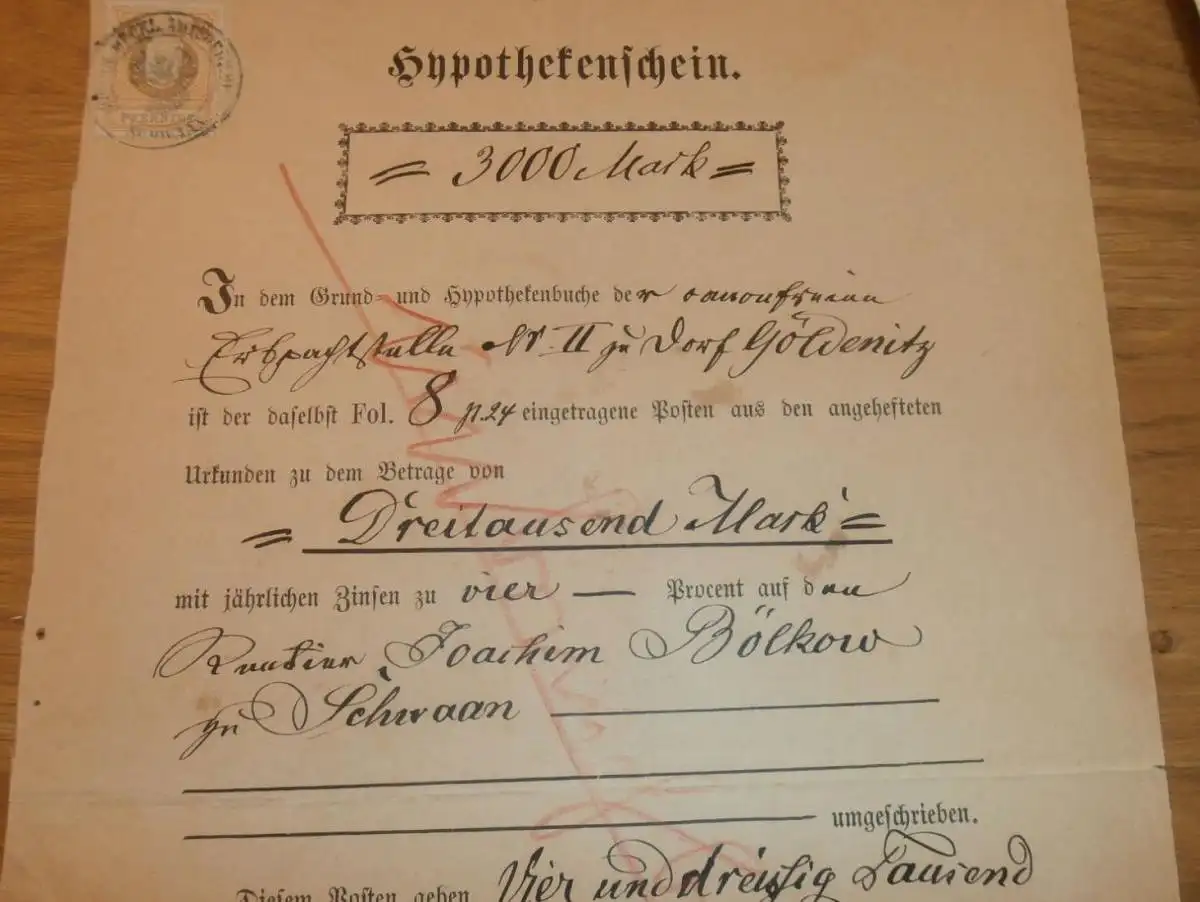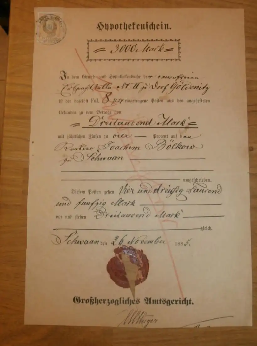 Hypothekenschein , Dorf Göldenitz , 1885 , Joachim Bölkow in Schwaan , Hypothek , Mecklenburg !!