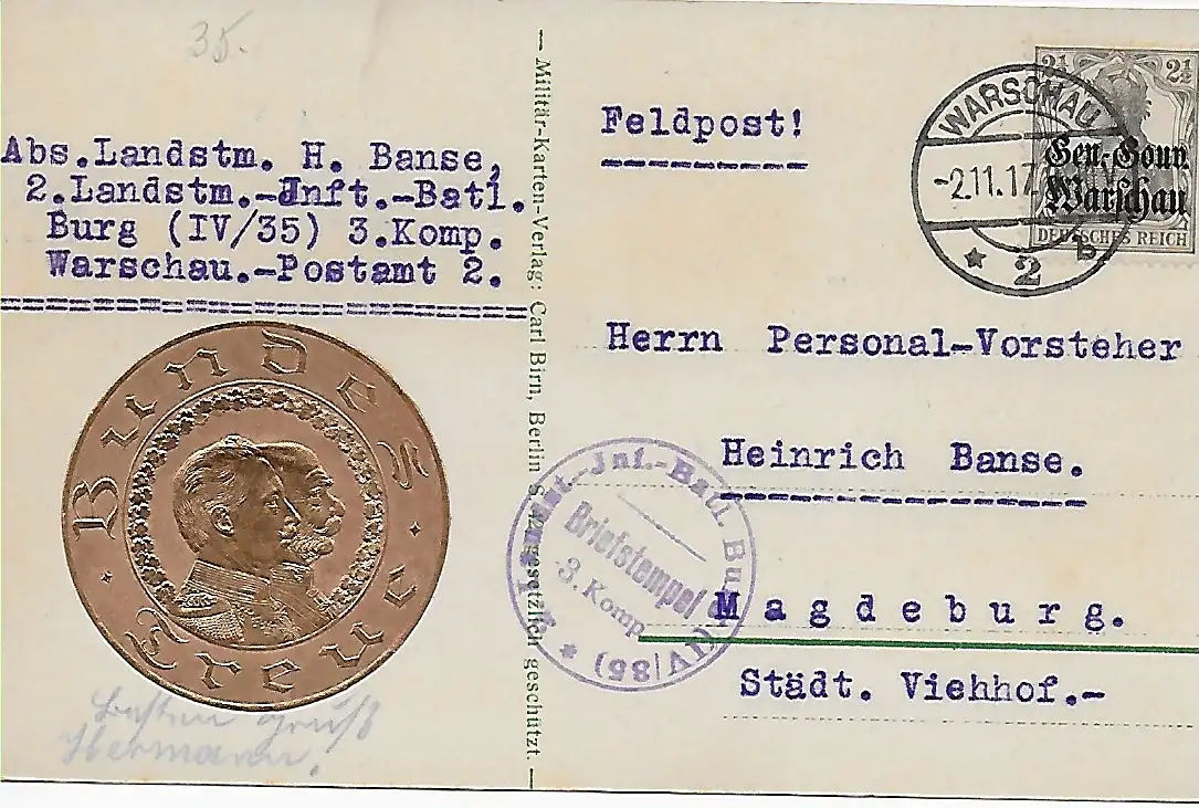 I. WK Polen: Feldpost Warschau, Burg nach Magdeburg, Rückseitig Eisenbahn Rg. 3
