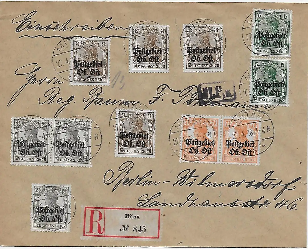 I. WK Polen: OB. Ost, Einschreiben Mitau nach Berlin Wilmersdorf 1918,