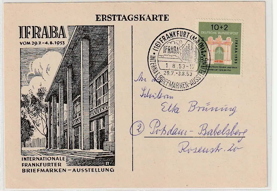 IFRABA 1953: 10 Pfg. portorichtig, Bedarf auf Schmuckkarte