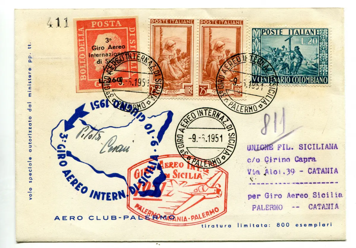 - III Giro Aereo di Sicilia - Aerogramm Etappe Catania/Palermo mit Ann. Sondermarke (rot) und frankierte Pilotensignatur mit Nr. 660 + Ergänzungsnummer 643 - Seltene Nr. 951/A