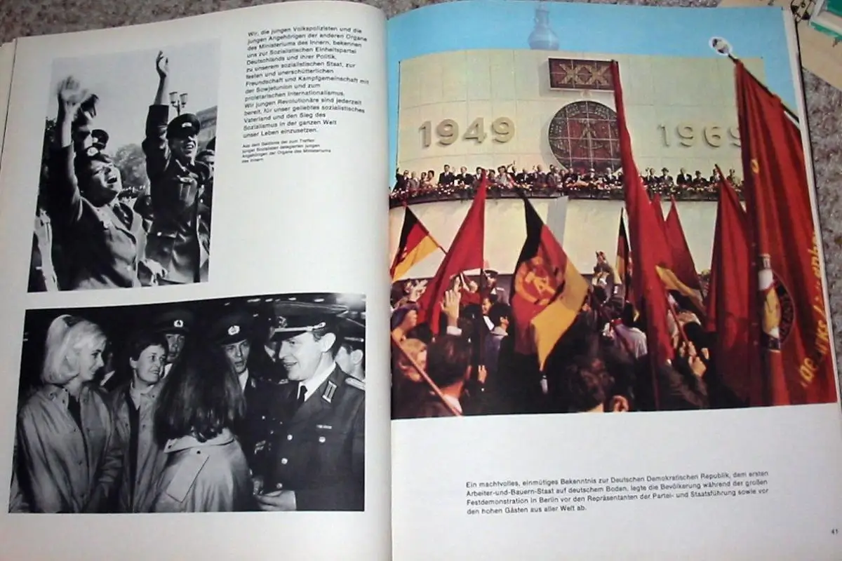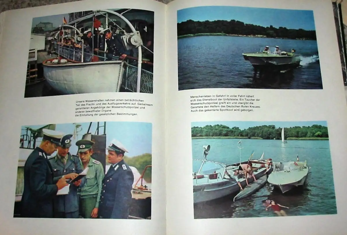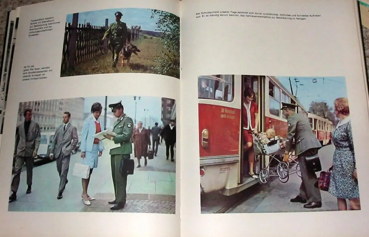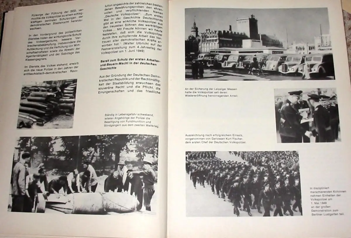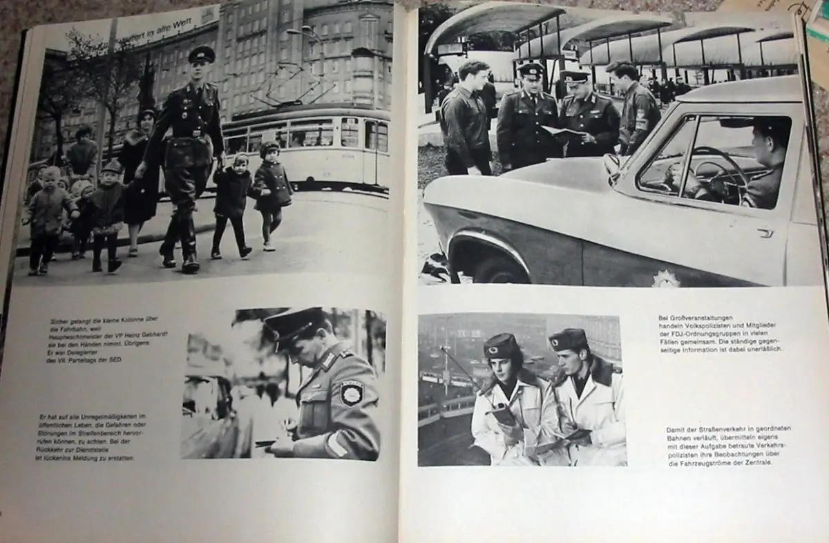 sehr guter Zustand, geringe Gebrauchs- und Alterungsspuren, Herausgegeben zum 25. Geburtstag der Volkspolizei der Bildband dokumentiert die Geschichte der Volkspolizei der DDR von der Einrichtung ihres Vorgängers 1945 durch die sowjetische Militäradministration bis zur Drucklegung des Buches 1969 - ihre Aufgaben, Ziele, Methoden, Freizeitgestaltung (Sport) werden in Bild und Text dargestellt "Geführt von der marxistisch-leninistischen Partei, haben die Angehörigen der Deutschen Volkspolizei und der anderen Organe des Ministeriums des Innern sich jederzeit des Vertrauens der Bürger unseres Staates würdig erwiesen. In konsequenter Erfüllung ihres Eides haben sie unter allen Bedingungen der Lage gemeinsam mit den anderen bewaffneten Kräften die Unantastbarkeit der sozialistischen Staats- und Gesellschaftsordnung, die Sicherheit und Souveränität der Deutschen Demokratischen Republik sowie den sicheren Schutz des friedlichen Lebens des Volkes und seiner sozialistischen Errungenschaften garantiert. Durch ihre bewußte Aktivität bei der Erfüllung ihres Klassen- und Verfassungsauftrages tragen die Angehörigen der Organe des Ministeriums des Innern dazu bei, das Ansehen unserer Republik ständig zu erhöhen. In ihrer gesamten Tätigkeit lassen sie niemals außer acht, daß der Imperialismus aggressiv und gefährlich ist. Sie sind sich stets dessen bewußt, daß es gilt, weiterhin die Einsatzbereitschaft und Wachsamkeit unablässig zu vervollkommnen und die im System der Landesverteidigung zu lösenden Aufgaben gewissenhaft zu erfüllen... Die Gewährleistung einer hohen Ordnung und Sicherheit ist eine Grundbedingung für die weitere Gestaltung des entwickelten gesellschaftlichen Systems des Sozialismus. Sie beeinflußt die Entwicklung des Staats- und Rechtsbewußtseins sowie neuer Verhaltensweisen der Menschen und wirkt damit auf die Steigerung der Arbeitsproduktivität ein, die letztlich den Sieg im ökonomischen Wettbewerb zwischen Sozialismus und Imperialismus entscheidet. Mit der Herausbildung der sozialistischen Menschengemeinschaft wachsen gleichzeitig die Bedingungen für die allseitige Gewährleistung der öffentlichen Ordnung und Sicherheit. Das Zentralkomitee erwartet von den Parteiorganisationen im Bereich des Ministeriums des Innern sowie von den Offizieren aller Dienststellen und Einheiten, daß sie die ihrer Führung anvertrauten Kollektive durch umsichtige und kluge Überzeugung, Erziehung und allseitige Information für die schöpferische Verwirklichung der Parteibeschlüsse befähigen und die Erfahrungen der Schrittmacher zur Sache aller machen. Wissenschaftlicher Vorlauf, gute Planung und Organisation der Arbeit, die ständige Verbindung von Prognose und täglicher Dienstdurchführung müssen stets gepaart sein mit hohem Niveau in der Arbeit mit den Menschen.", Kunstleder, ca. 24,5 x 32,5, 192 Seiten mit 41 Farb- und 265 Schwarzweißfotos