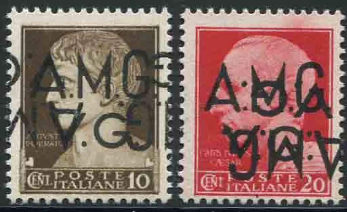 Imperiale Cent. 10 und 20 Sorten Doppelaufdruck Vollgummi - AMG. Sehr guter Zustand. - Imperiale Cent. 10 und 20 (Nr. 1f, 4f) die beiden Werte mit doppeltem Aufdruck davon einer umgedreht - Top Qualität - Selten - Kat. euro 900 n. 955/5