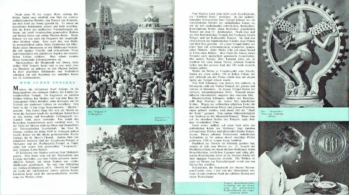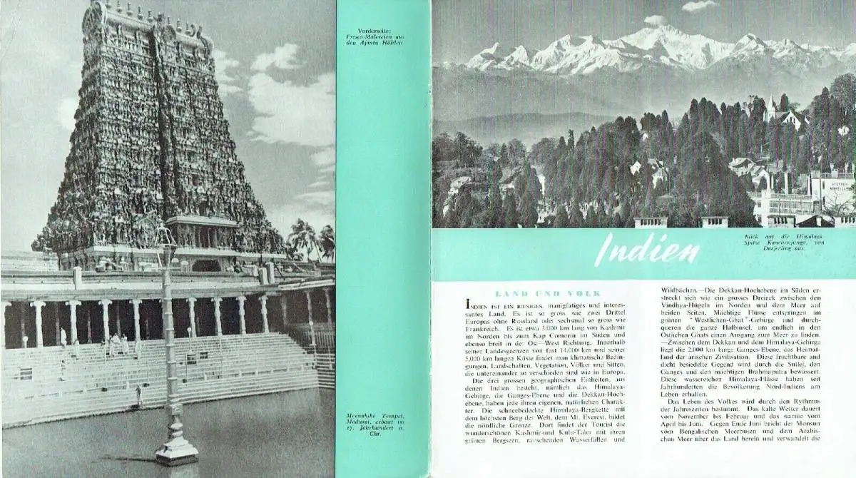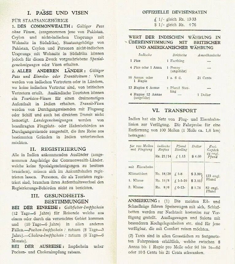 guter bis sehr guter Zustand, geringe Gebrauchs- und Alterungsspuren: Umschlag und Seiten teils etwas eselsohrig - Kanten gelegentlich mit kleinen Blessuren, Touristen-Prospekt und Fremdenverkehrs-Regeln in deutscher Sprache zur Datierung: auf Seite 4 steht, daß die neue Verfassung (1949) vor 4 Jahren ausgearbeitet wurde - Land und Volk - Religionen - Die alte Zivilisation - Wissenschaft und Literatur - Modernes Indien - Verkehrswege - Der Westen Indiens - Der Norden - Zentralindien - Touristen-Karte - Der Osten - Der Süden - Kunst und Unterhaltung - Sport - Handwerk - Beilage: Pässe und Visen, Registrierung, Gesundheitsbestimmungen, Zoll, Währung, Transport, Hotels, Klima und Kleidung, was kauft man?, Nützliche Hinweise, kartoniert, ca. 20,5 x 23 (Beilage ca. 10 x 22), 16 Seiten mit 30 Bildern, einer Karte und einer Beilage