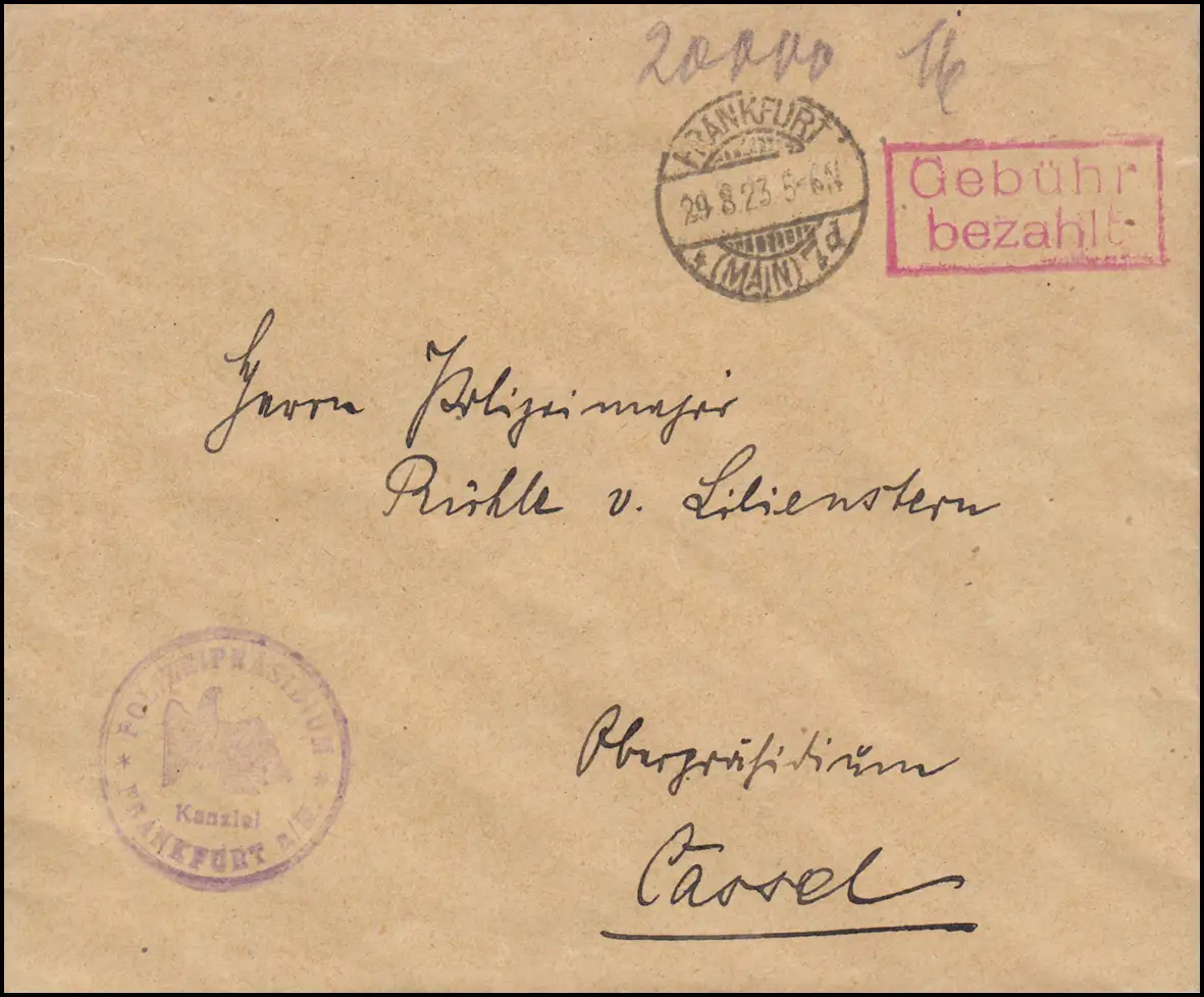 Portogerechter Brief im Fernverkehr (handschriftlich 20.000) vom Polizeipräsidium Kanzlei Frankfurt/Main an eine Polizeimajor in Cassel / Kassel.