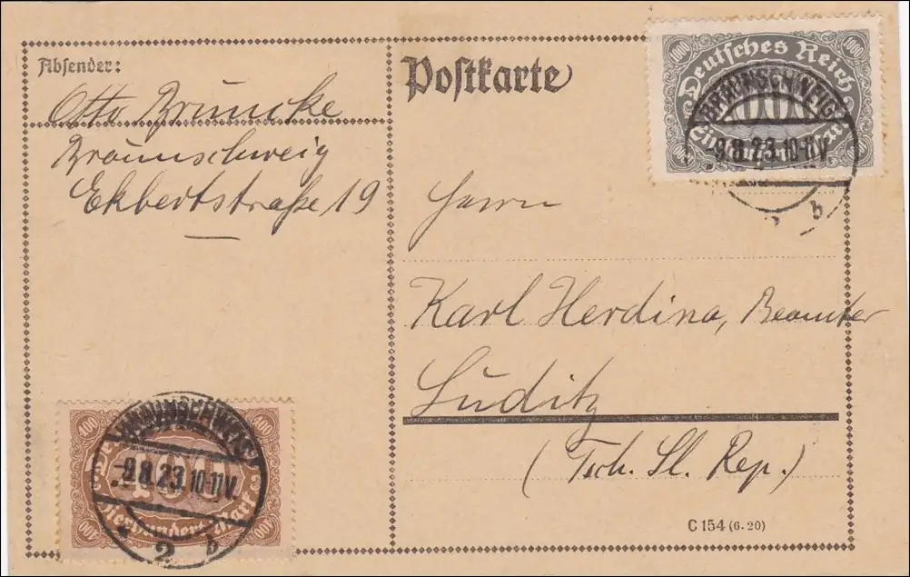 Inflation: Postkarte von Braunschweig nach CSSR, 9.8.1923