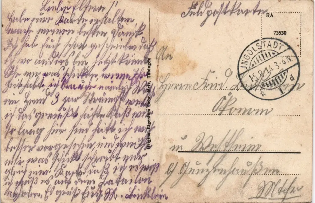1. WK Feldpost gelaufen mit Stempel INGOLSTADT