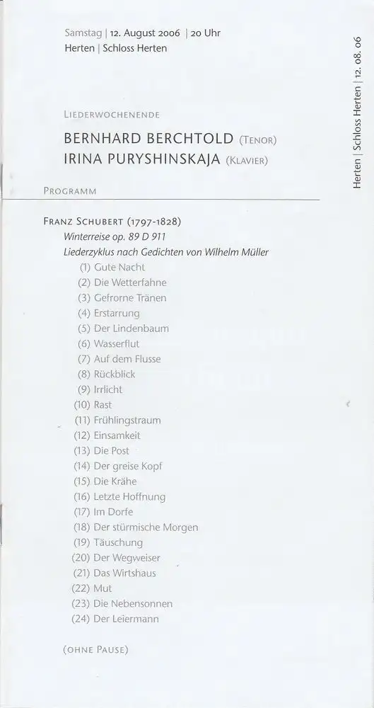 Berhard Berchthold ( Tenor ). Irina Purshinskaja ( Klavier ). Vortragsfolge: Franz Schubert: Winterreise op. 89 D 911. Liederzyklus nach Gedichten von Wilhelm Müller: Gute Nacht, Die Wetterfahne, Gefrorne Tränen, Erstarrung, Der Lindenbaum, Wasserflut, Auf dem Flusse, u. a. - Theaterprogramm, Opernprogramm, Ballettprogramm, Musicalprogramm, Konzertprogramm, Theatermemorabilia, Programmhefte Sammlung, deutsche Theatergeschichte.