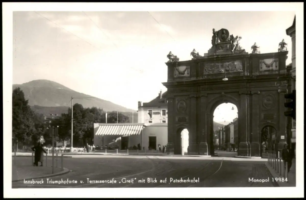 Innsbruck Triumphpforte Terrassencafe .Greif" mit Blick auf Patscherkofel 1929