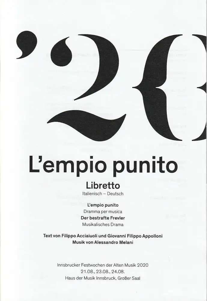 Titel: Textbuch Alessandro Melani L'EMPIO PUNITO 21., 23. + 24.8.2020 Haus der Musik Innsbruck Innsbrucker Festwochen der Alten Musik 2020