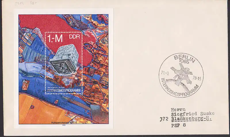 Intekosmosprogramm Block mit Multispektralkamera SSt. Berlin 21.3.78, Blankoumschlag (2313)