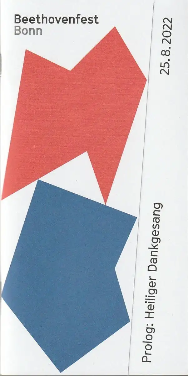 Beethovenfest Bonn 25.8. bis 17.9.2022. Mitwirkende: Vox Luminis, Leitung: Lionel Meunier. Armida Quartett: Martin Funda, Violine / Johanna Staemmler, Violine / Teresa Schwamm-Biskamp, Viola / Stefan Heinemeyer, Violoncello. Miguel Perez Inesta, Klarinette. Kristina Edin, Kontrabass. Kaan Bulak, Live Elektronik. Programm: CAROLINE SHAW: aus To the Hands für Stimmen und Streichquartett, Her Beacon-Hands Beckon, Ever Ever Ever, u. a. OSVALDO GOLIJOV: aus The Dreams and Prayers of Isaac the Blind für Klarientte und Streichquartett, Liberamente. LUDWIG VAN BEETHOVEN: Dritter Satz aus dem Streichquartett Nr. 15 a-Moll op. 132. DIETRICH BUXTEHUDE: Ad manus , für Gesangsstimmen und Instrumente BuxWV 78 - Theaterprogramm, Opernprogramm, Ballettprogramm, Musicalprogramm, Konzertprogramm, Theatermemorabilia, Programmhefte Sammlung, deutsche Theatergeschichte.