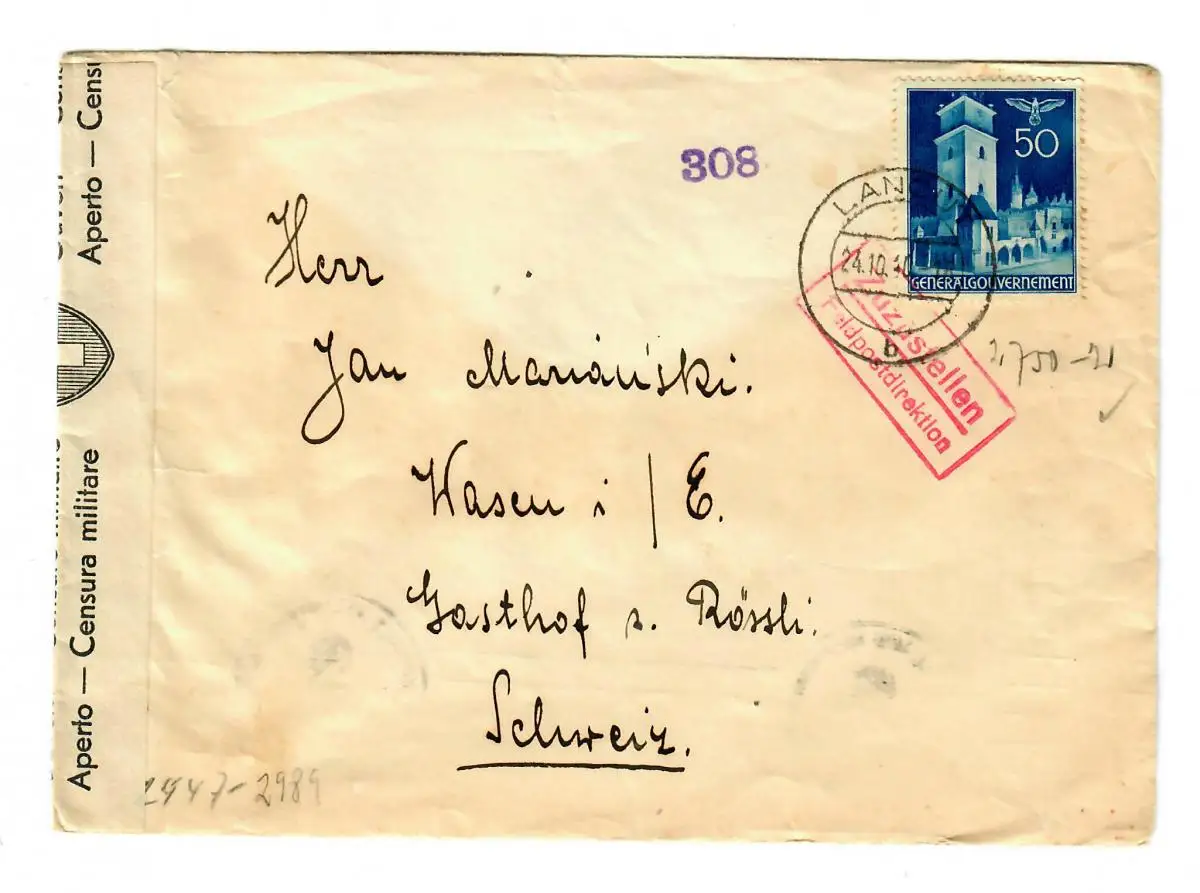 Interniertenpost GG: Brief portogerecht von Lancut nach Wasen, 2x Zensur