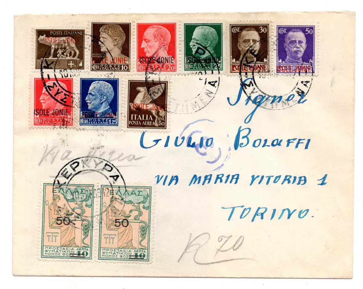 Ionische Inseln - Kaiserreich Mischfrankatur mit Griechenland auf Umschlag - Ionische Inseln - Kaiserreich aufgedruckt Nr. 1/8 + P.A. Nr.1 Mischfrankatur mit Briefmarken aus Griechenland auf Briefumschlag von Korfu nach Turin am 10.4.42 - Rückseite Ann. und Zensurband - Uncommon Code 842/11