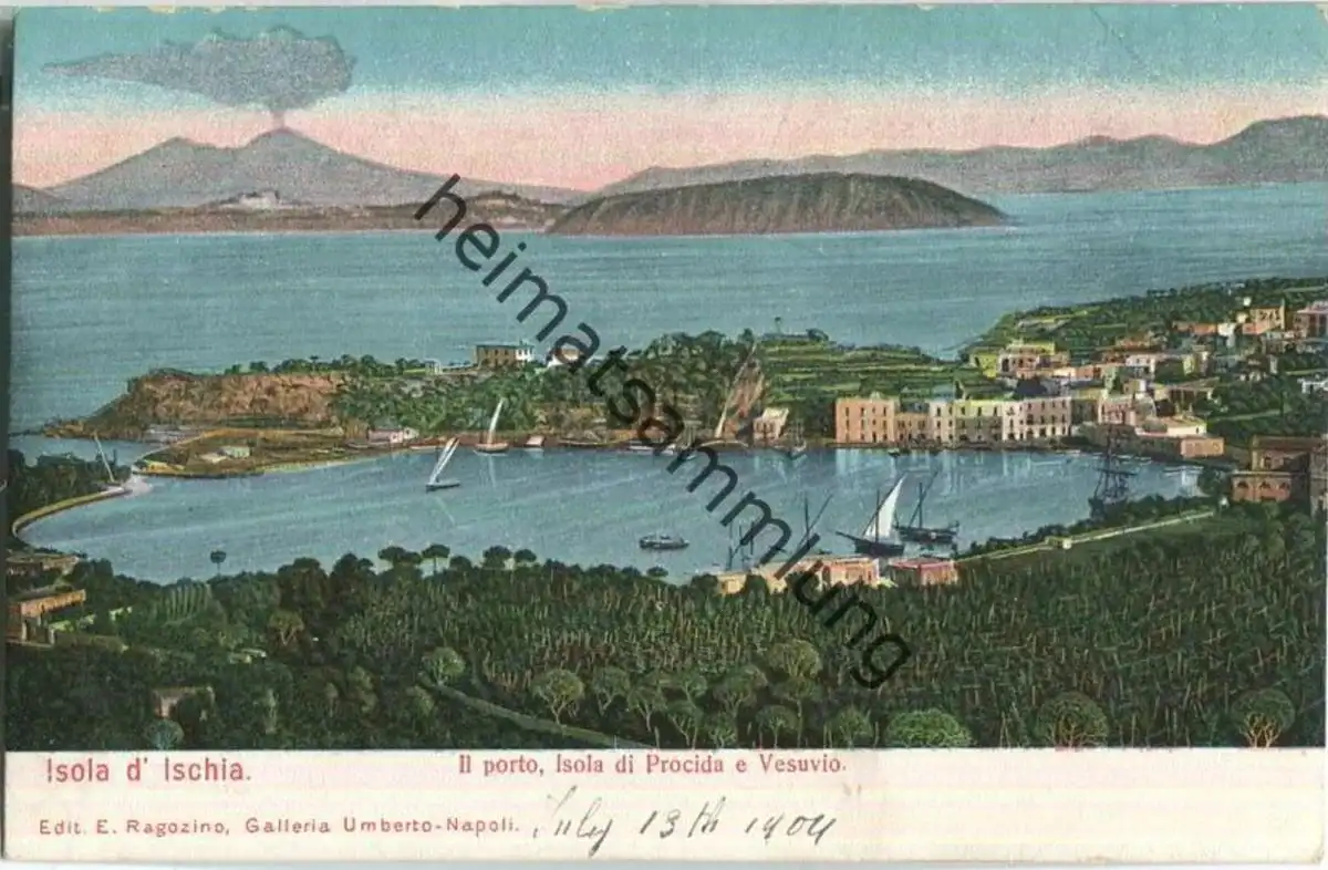 Isola d' Ischia - Il porto Isola di Procida e Vesuvio - Edit. E. Ragozino Napoli ca. 1900