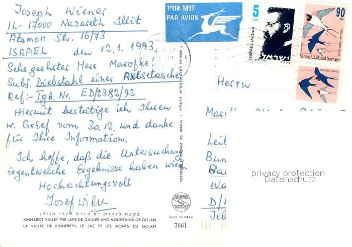 Israel Kinnarot Valley the Lake de Gallilee and Mountains of Golan Fliegeraufnahme Israel postalisch gelaufen 1993 Erhaltung siehe scans [WerneD78] WernPID7
