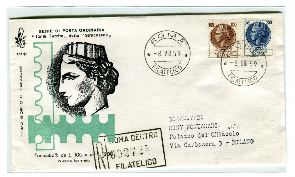 Italia FDC Venetia 1959 Siracusana Lit. 100 und 200 gereist Racc. für Italien Italien Italien 1959 Siracusana Lit. 100 und 200 auf FDC Umschlag gereist Racc. für Italien mit Annullierung der Ankunft Cod. 214 / Venetien