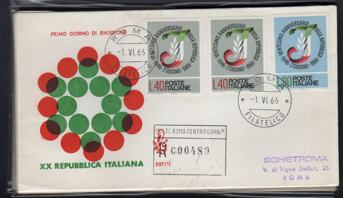 Italia FDC Venetia 1966 Ventennale Rep. gereist Racc. für Italien Italien Italien 1966 Ventennale Rep. auf Reiseumschlag Racc. für Italien mit Annullierung der Ankunft Annullo Roma Philatelico Cod. 703/Venetia