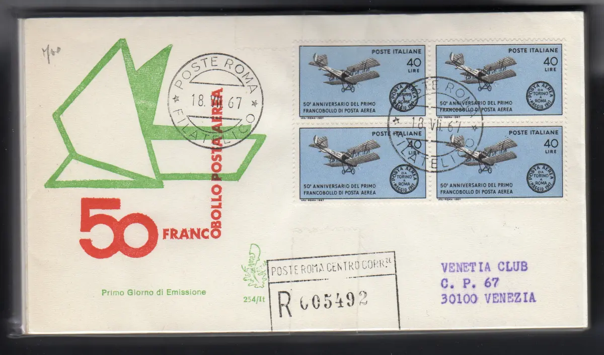 Italia FDC Venetia 1967 50. Luftpost Viertel gereist Racc. für Italien Italien Italien 1967 50. Viertelluftpost auf Reiseumschlag Racc. für Italien mit Annullierung der Ankunft Annullo Roma Philatelico Cod. 775/Venetia
