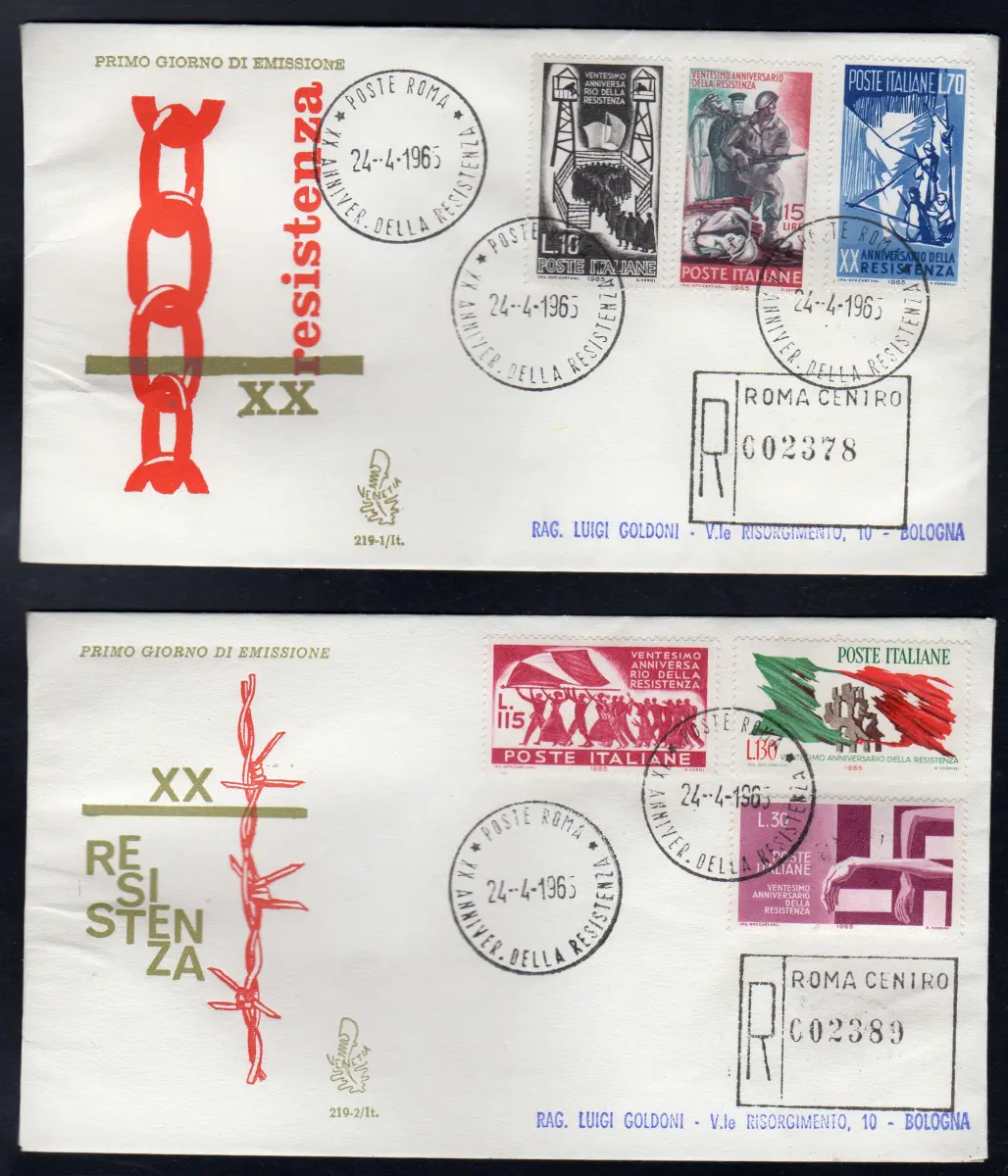 Italien FDC Venetia 1965 XX Anniversario della Resistance voyata Racc. für Italien Italien Italien 1965 XX Jahrestag des Widerstands auf Reiseumschlag Racc. für Italien mit Anreise-Stornierung Abfahrt Stornierung Figurato Roma R von großem Einschreiben - Umschlag 1 Affr. Mit Lire 10 + 15 + 70 Cod. 634 / Venetien