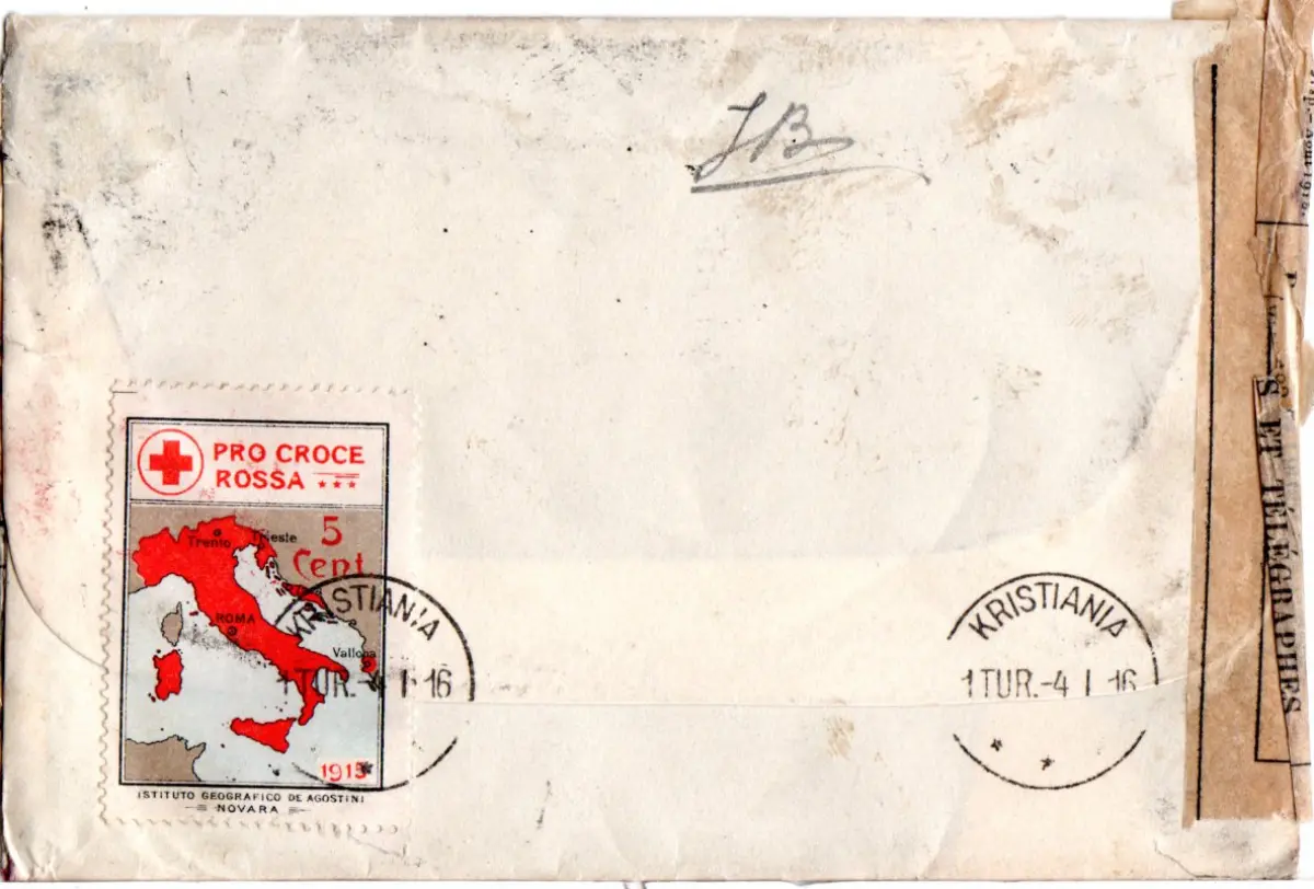 Spendenmarke 5 Cent Pro Croce Rossa rückseitig auf Zensurbrief v. Ponte San Pietro n. Kristiania