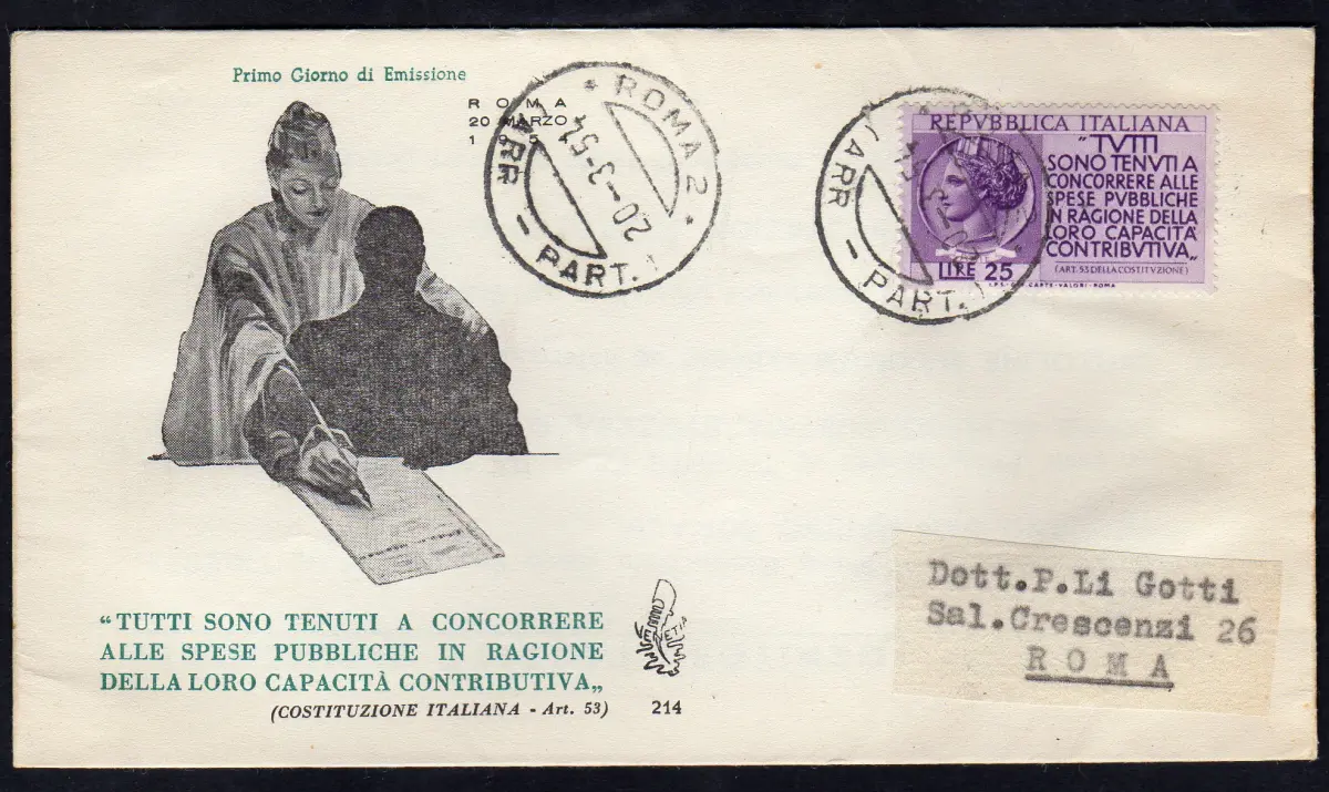 Italien FDC Venetia 1954 Nicht gereiste Beitragskampagne für Italien Italien 1954 Beitragskampagne auf nicht gereistetem FDC-Umschlag nach Italien Cod. 392 / Venetien