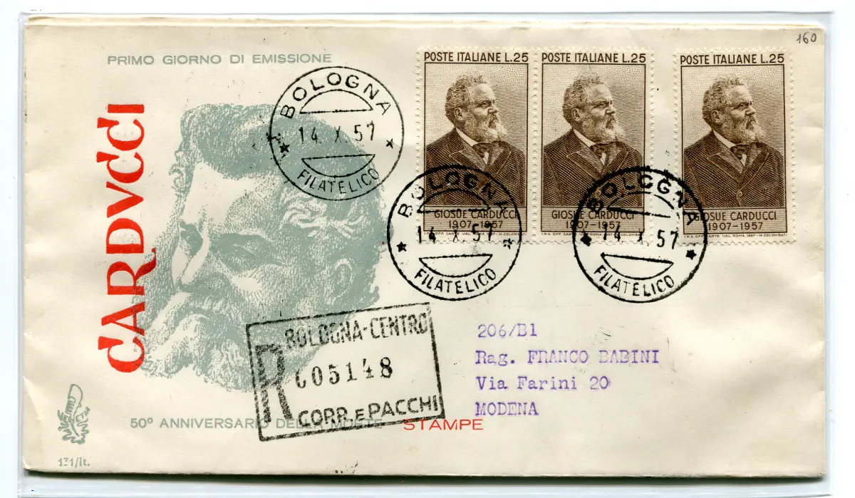 Italien FDC Venetia 1957 Carducci Paar + Einzelreise Racc. für Italien Italien Italien 1957 Carducci Paar + Single auf FDC Umschlag gereist Racc. für Italien mit Annullierung der Ankunft - Abreise - Annullierung Bologna Philatelico Cod. 1491/Venetia