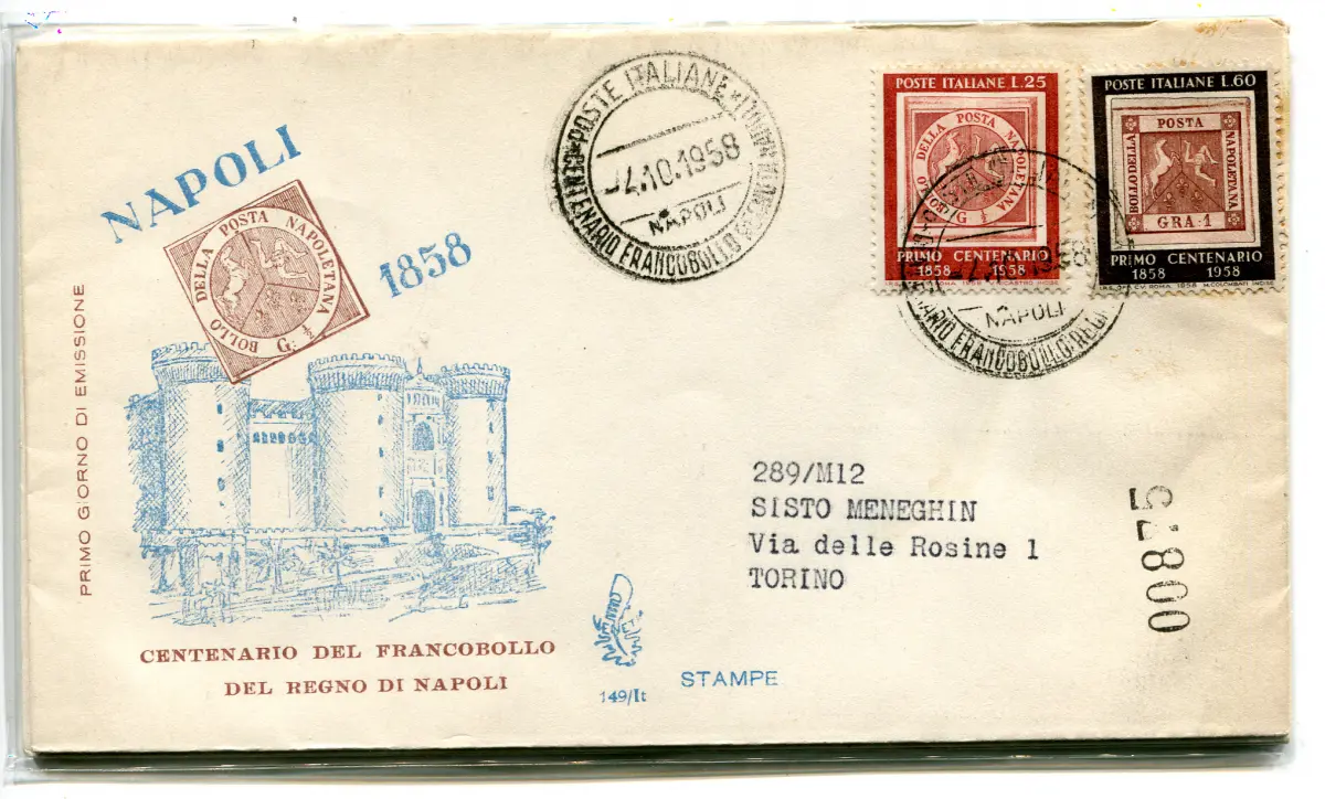 Italien FDC Venetia 1958 Centenario Franc. Neapel gereist Racc. für Italien Italien Italien 1958 Centenario Franc. Neapel auf Umschlag FDC gereist Racc. für Italien mit Annullierung der Ankunft - Abreise - Bildliche Annullierung der Ausgabe Cod. 1484/Venetia