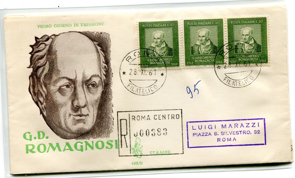 Italien FDC Venetia 1961 Romagnosi Dreierstreifen gereist Racc. für Italien Italien Italien 1961 Romagnose Dreierstreifen auf FDC Umschlag gereist Racc. für Italien mit Annullierung der Ankunft - Abreise Annullierung Rom Philatelistisch Cod. 1492 / Venetien