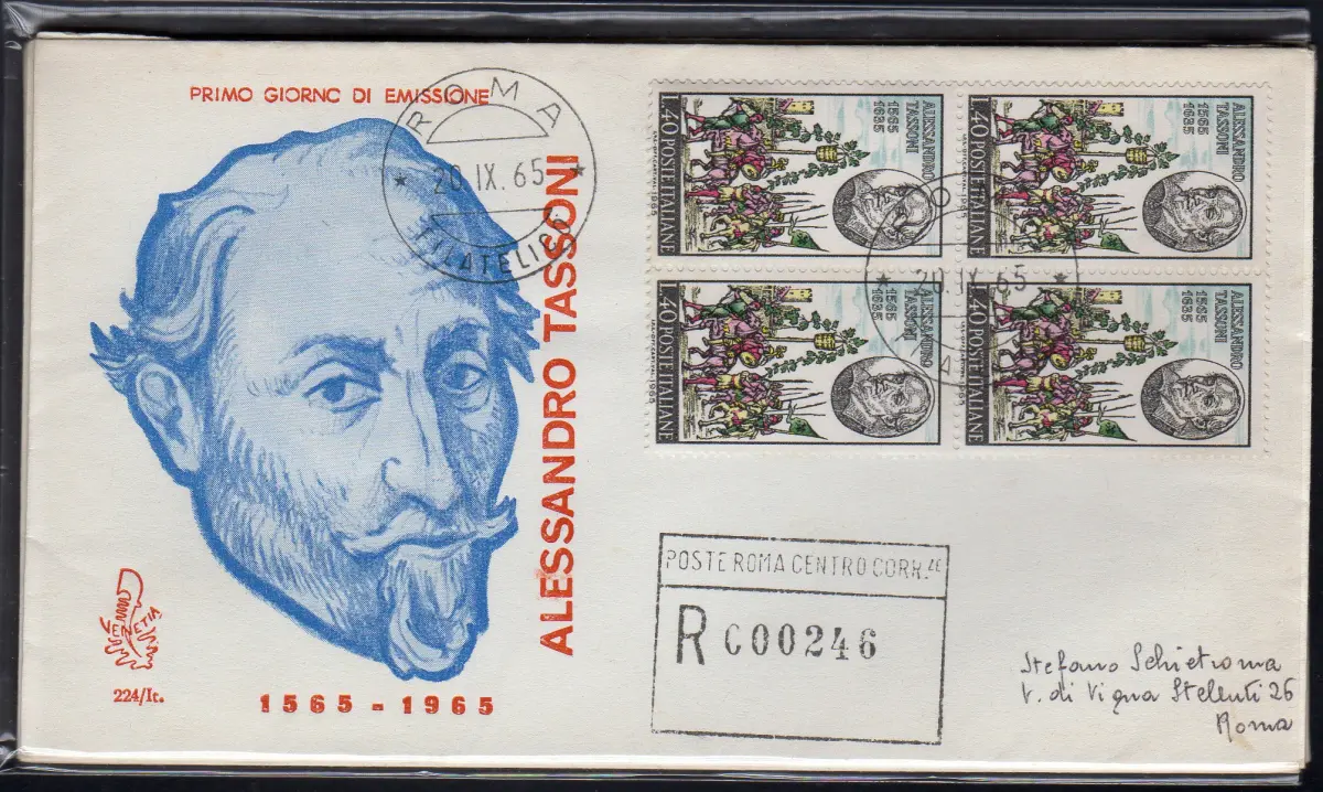 Italien FDC Venetia 1965 Tassoni Viertelreise Racc. für Italien Italien Italien 1965 4. Hundertjahrfeier Alessandro Tassoni Viertel auf Reiseumschlag Racc. für Italien OHNE Annullierung der Ankunft - Abreise Annullo Roma Philatelico Cod. 659/Venetia