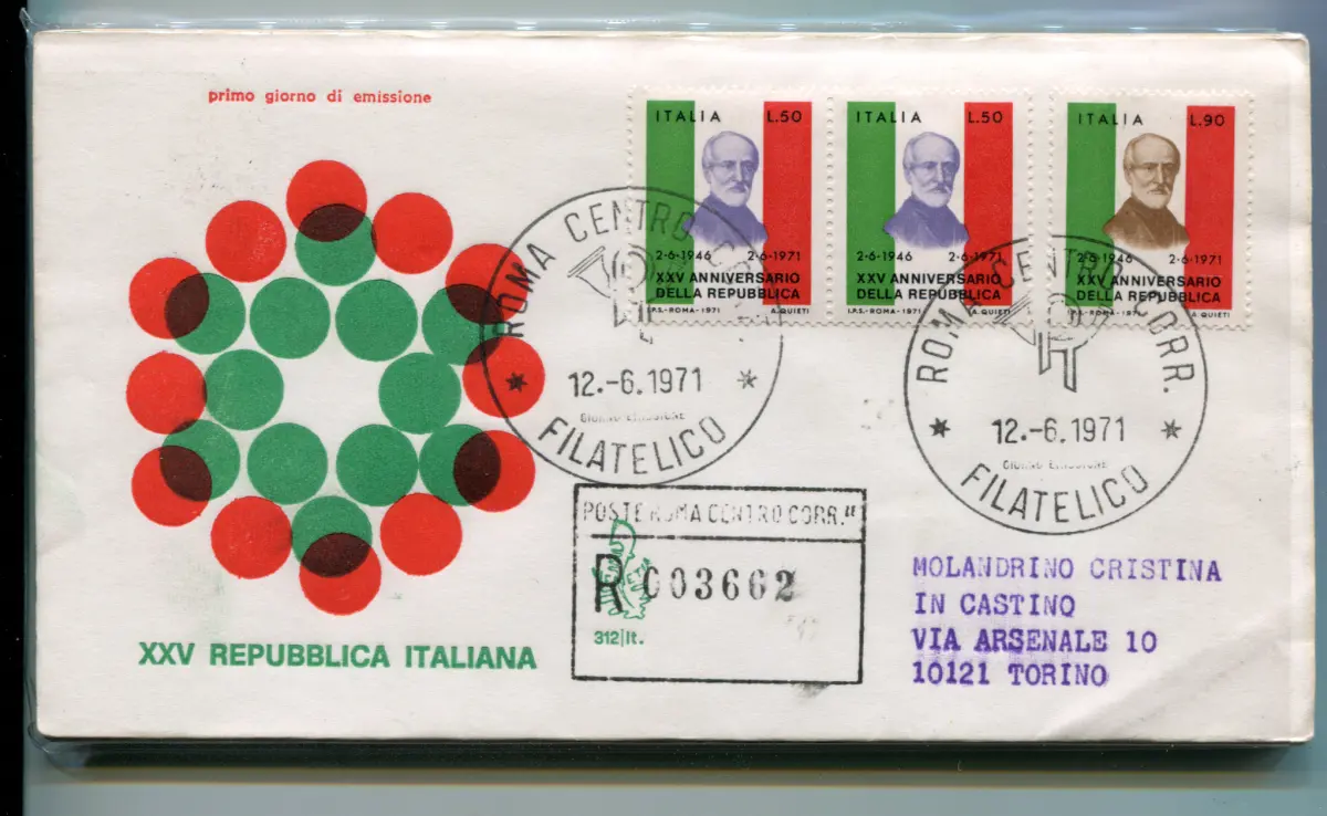 Italia FDC Venetia 1971 25. Ann. Republik Dreierstreifen gereist Racc. für Italien Italien Italien 1971 25. Ann. Republik Dreierstreifen auf Reiseumschlag Racc. für Italien mit Annullierung der Ankunft Annullo Roma Philatelico Cod. 955/Venetia
