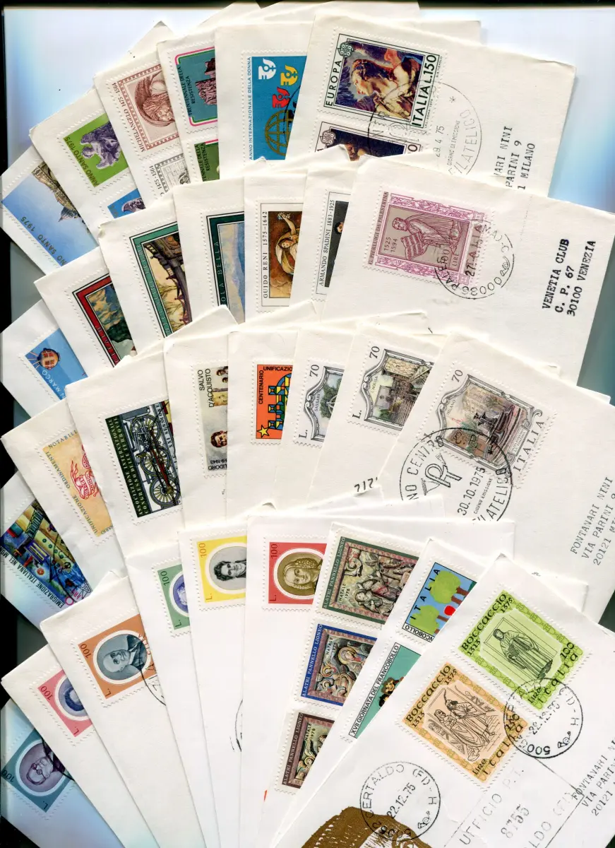 Italien FDC Venetia 1975 Kompletter Jahrgang Italien 1975 Kompletter Jahrgang auf Umschlag FDC 30 Umschläge, Teil gereist Einschreiben mit Annullierung der Ankunft - in gutem Zustand - Cod. 363 / Venetien