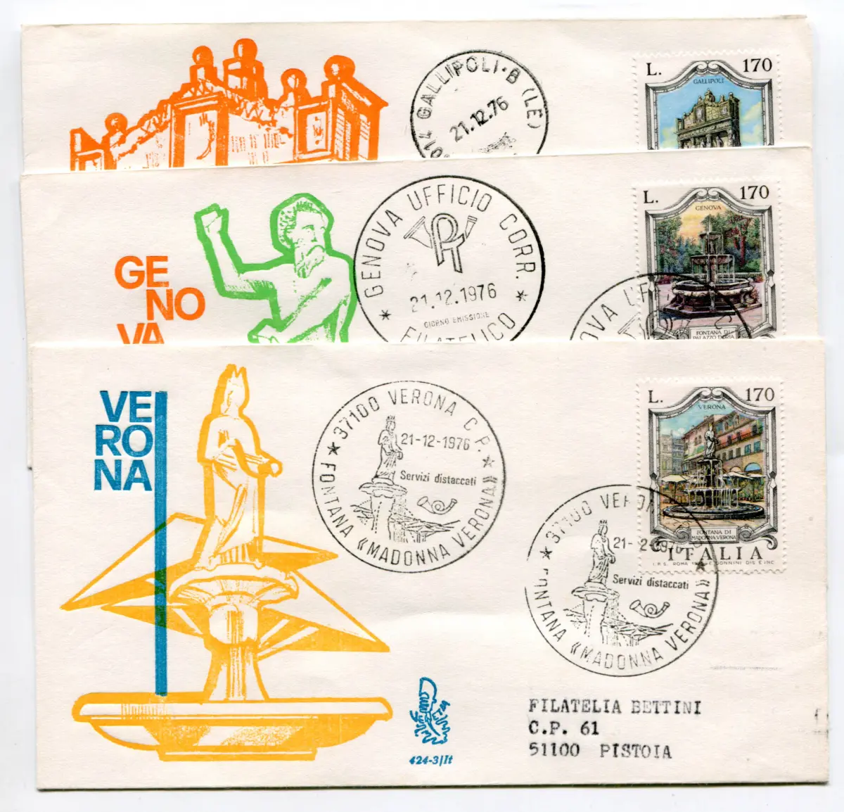 Italien FDC Venetia 1976 Brunnen reiste nach Italien Italien 1976 Brunnen auf Umschlag FDC reiste nach Italien mit Annullierung der Ankunft Annullo Gallipoli, Speciale di Verona e Genua Philatelico Cod. 1445/Venetia