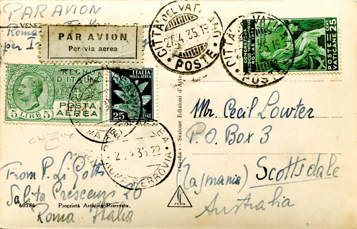 Italien/Vatikan - Luftpostkarte nach Australien AK - Italien/Vatikan - Luftpostkarte nach Australien am 27.4.35 frankiert mit Cent. 25 Juridico (Nr. 43) + Italia Posta Aerea Lire 5 + Cent. 25 (Nr. 7 + 10) - auf der Rückseite Annullierung des Transits Brindisi Luftpost am 28.4.35 - Postkarte von P. Ligotti zur Weiterleitung auf dem I. Imperial Airways Flug - Selten Cod. 862/16