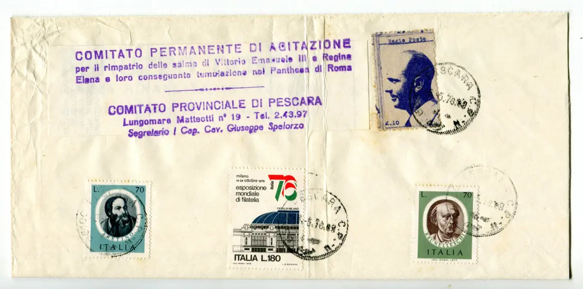 Italienische Monarchische Union - Lire 10 auf Umschlag - Italienische Monarchische Union - Ausgabe politischer Propaganda Lire 10 violettes Bildnis von Umberto II. per Post auf Briefumschlag von Pescara nach Rom am 4.5.78 mit Ergänzungswerten übergeben - neben der Ann. mit violettem Stempel des Komitees für Rückkehr und Grabung im Pantheon Vitt. Emanuele III. und Königin Helena - Interessant für Fach Code Nr. 204/2