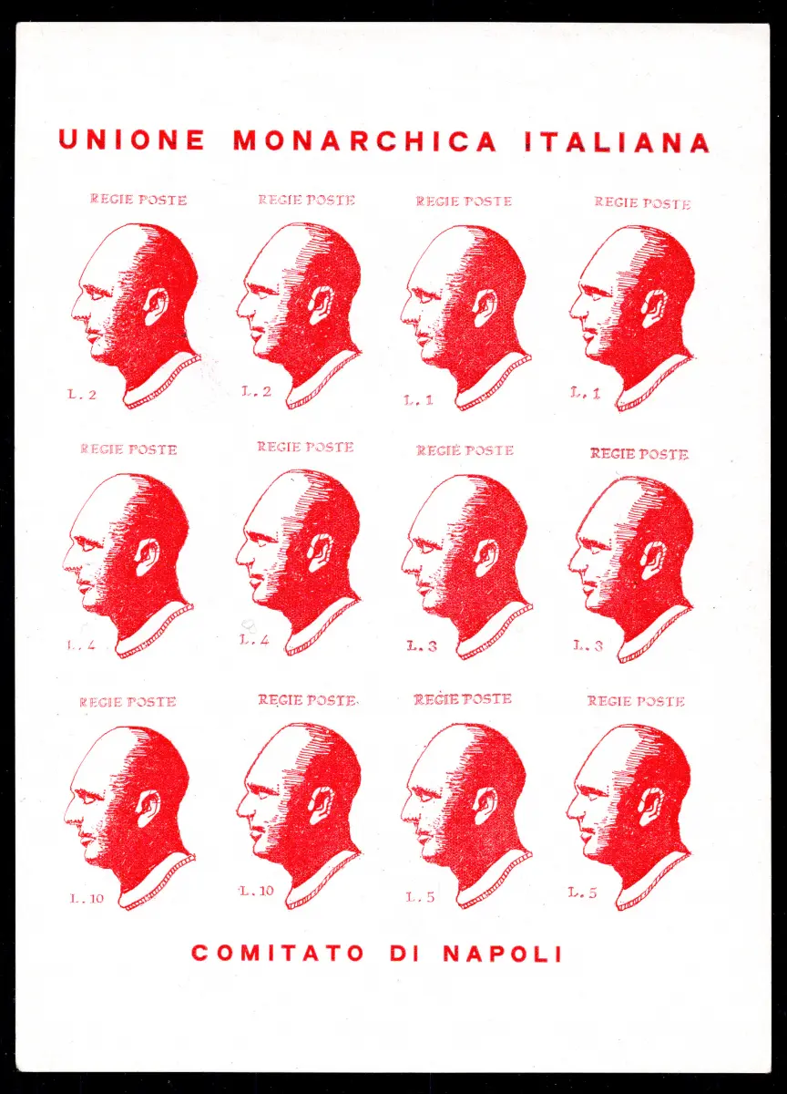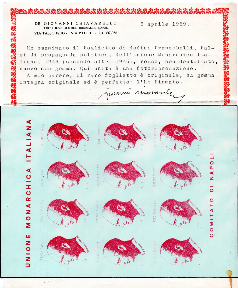 Italienische Monarchische Union - ungezähntes Blatt Vollgummi (MNH) - Italienische Monarchische Union - Ausgabe politischer Propaganda von Neapel Bildnis von Umberto II. der ungezackte Zettel von 12 Exemplaren in der Farbe rot (Kat. IEC S. 402 Bd. RSI / Leutnant Nr. F3) - Cert. CH - Selten - Kat. 5.000 Euro Code Nr. 207/2