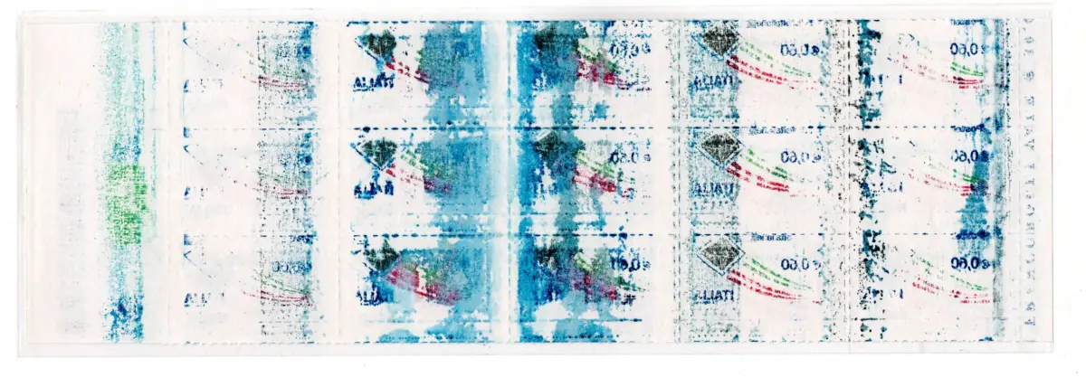 MNH - Vollgummi - Italienische Post Euro 0,60 Flugbrief Nr. 3102 Block von fünfzehn Exemplaren mit Barcode - verwirrende ölige Drucksorte der Farbe Blau und Grün - Durch diese starke Öligkeit erscheint der Druck auf der Rückseite - auffällig und selten für Sammler von Sorten mit Barcode - Unwiederholbar Cod. 957/17