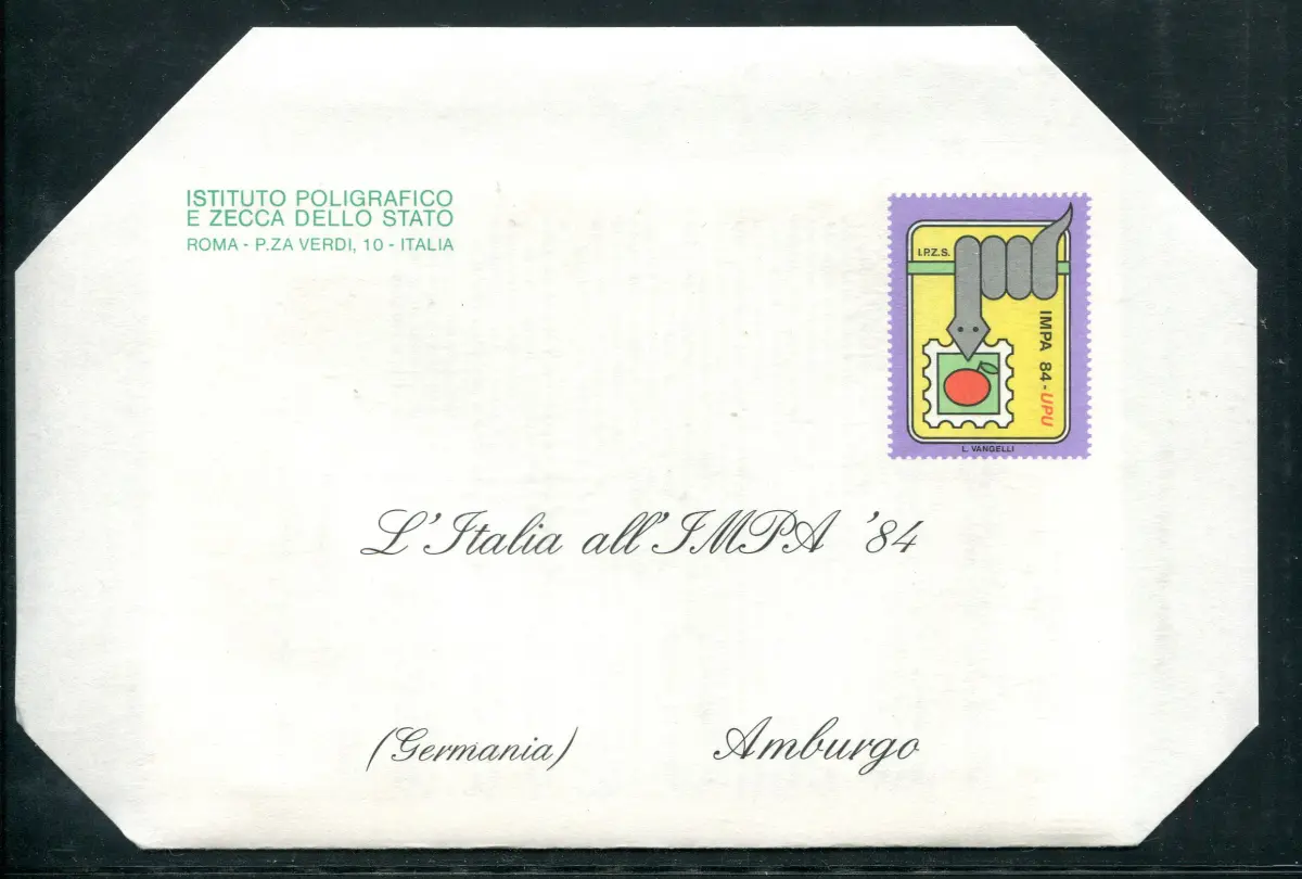Drei verschiedene Erinnerungsblätter an die italienische Teilnahme an IMPA 84 (Amburg) - Einige Themen aus touristischen Sendungen von 1974 und 1976, die in einer Postkarte ohne Nennwert angebracht sind, die vom Polygraphischen Staat in limitierter Auflage gedruckt wird - Uncommon Cod. 16/WEB
