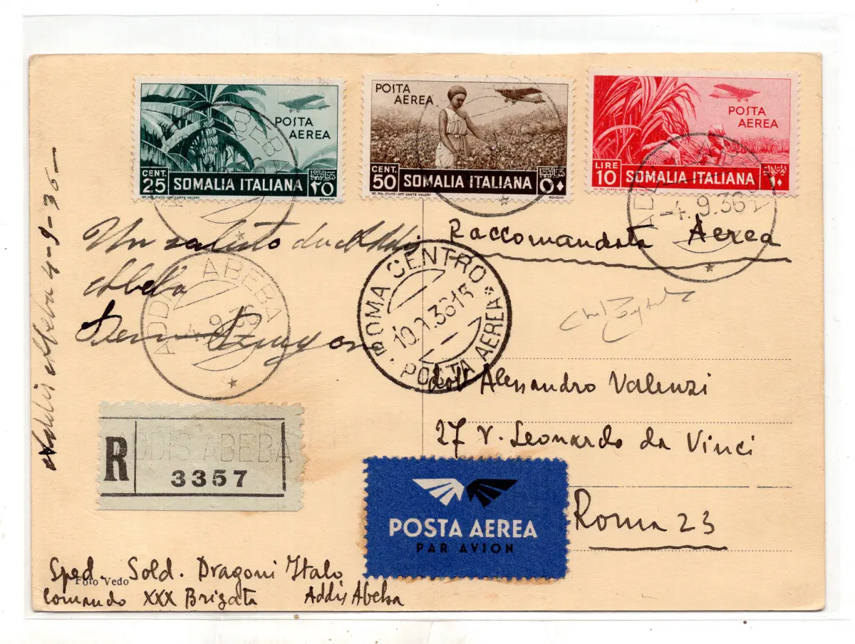 C - Italienisches Somalia - Verschiedene Subjekte Luftpost Nr. 17/26 die komplette Serie auf drei Kolonialkarten alle gereist Racc. per Luftweg von Addis Abeba nach Rom am 9.10.36 - Angenehm und selten zusammen - Ray. Cod.1081/182