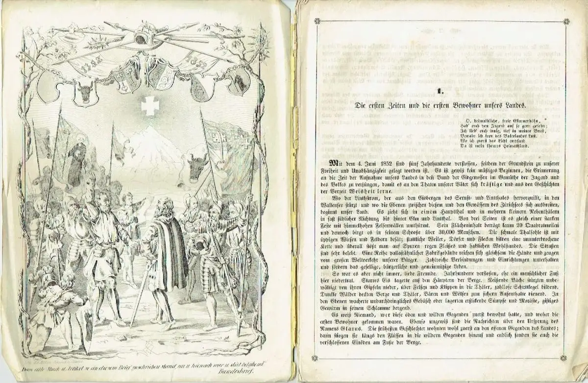 noch mittlerer Zustand, Gebrauchs- und Alterungsspuren: Umschlagrücken überwiegend aufgerissen, deshalb die beiden Bögen lose einliegend - teils etwas verschmutzt / verstaubt - Rückseite teils etwas zerkratzt - Seiten sauber und ordentlich - Umschlag und Seiten teils erheblich eselsohrig - Heft mittig quer geknickt, Die ersten Zeiten und die ersten Bewohner unsers Landes - Der christliche Glaube dringt in's Land und Glarus kommt unter Seckingen - Von dem Stifte Seckingen und der Einrichtung unseres Landes unter dessen Herrschaft - Die Meierei kommt an Fremde - Die Kastvogtei über Seckingen und Glarus - Die Waldstätte und ihre Befreiung - Glarus wird in den Bund der Eidgenossen aufgenommen - Schlußwort - Die alten Panner, Softcover, ca. 18,5 x 24, 20 Seiten mit 1n Bild