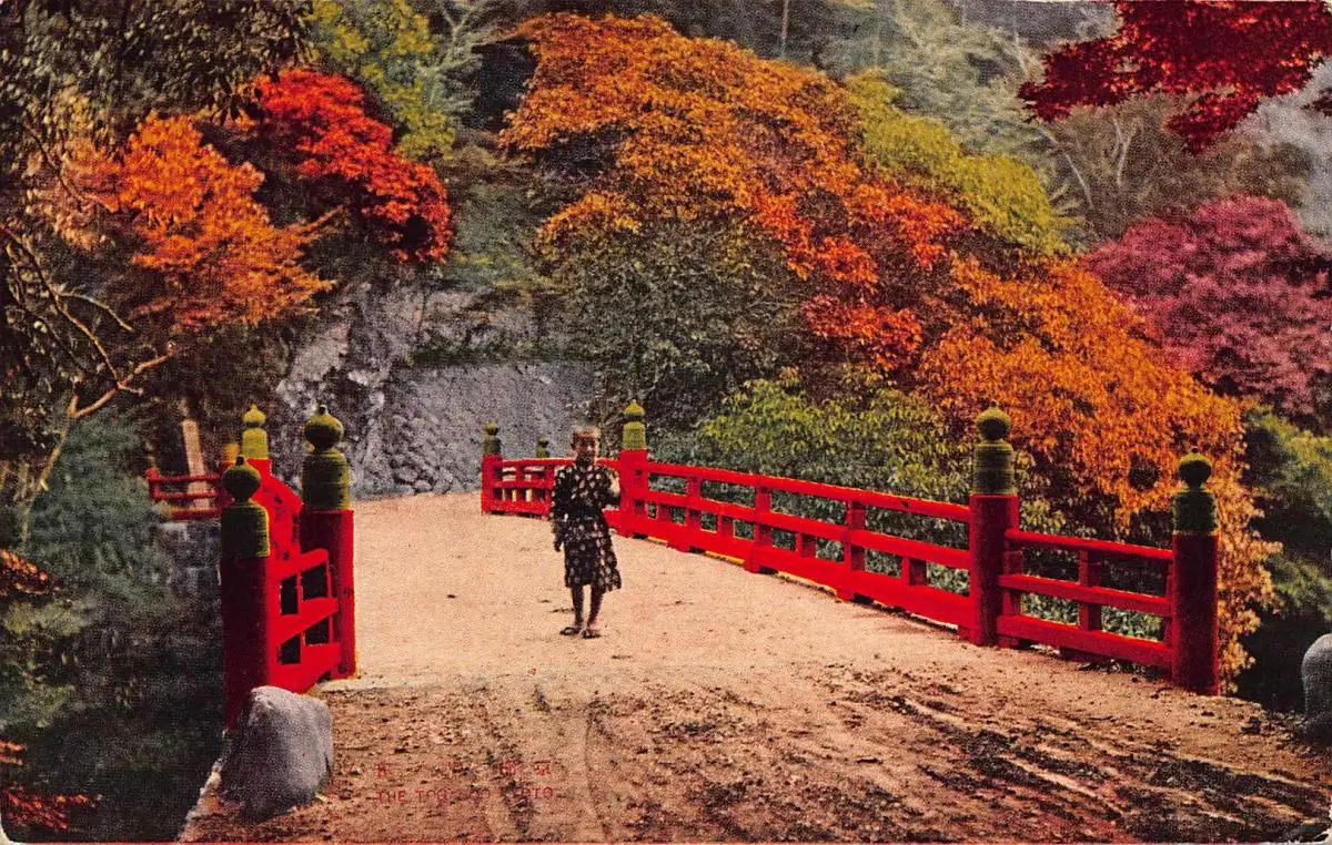 Japan Meiji no Mori Minō - Partie im Park mit Kind auf roter Brücke ngl 160.341